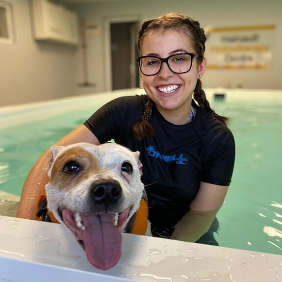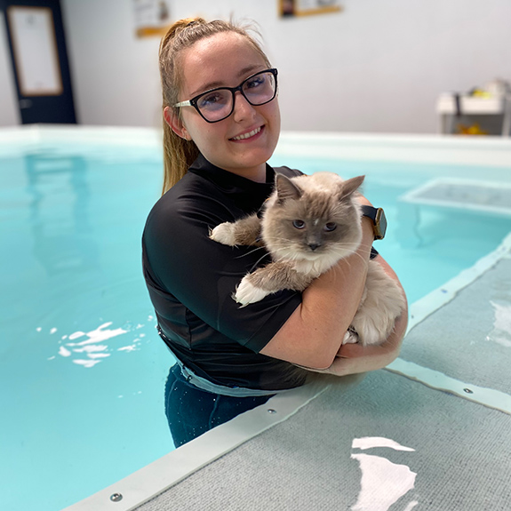 While studying Level 3 Animal Management in college, she volunteered in the kennels and cattery on site and observed some hydrotherapy sessions before taking on an apprentice role in the hydrotherapy centre.